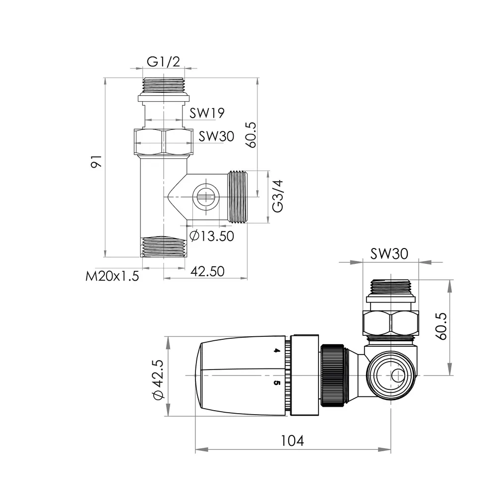 Designthermostatfühler mit Thermostatventil für Einzelanschluss. Geeignet für Zweirohrsysteme. Das Vorlauf-Eckventil ist hier voreinstellbar und das Rücklauf Eckventil ist absperrbar. Am Rücklauf befindet sich eine Vorrichtung zur Montage des Heizstabes.