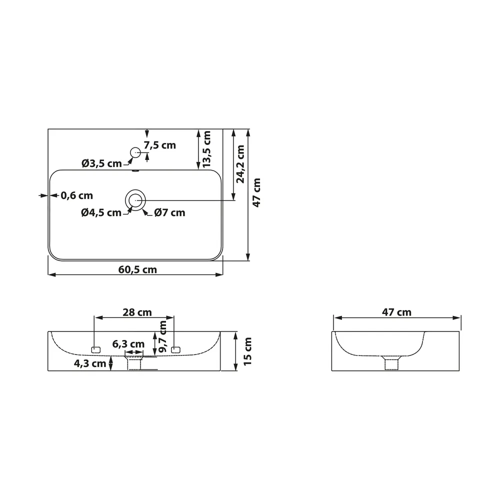 Großzügige Maße von 60,5 x 47 x 14,5 cm bieten viel Ablagefläche und machen den Waschtisch ideal für den täglichen Gebrauch.